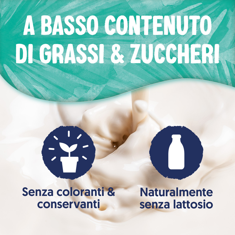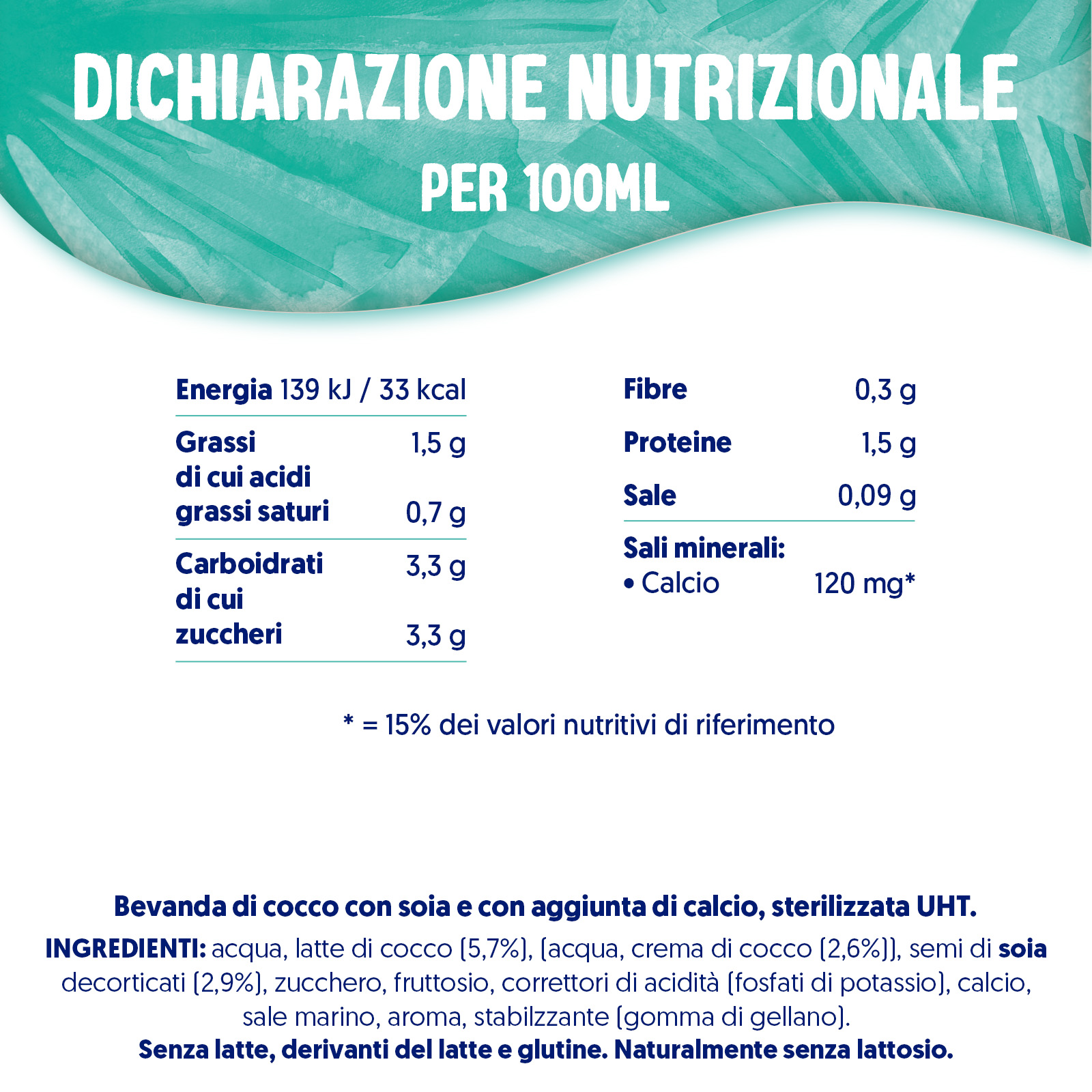 acqua, latte di cocco (5,7%) (acqua, crema di cocco (2,6%), semi di soia decorticati (2,9%), zucchero, fruttosio, correttori di acidità (fosfati di potassio), calcio, sale marino, aroma, stabilizzante (gomma di gellano).
