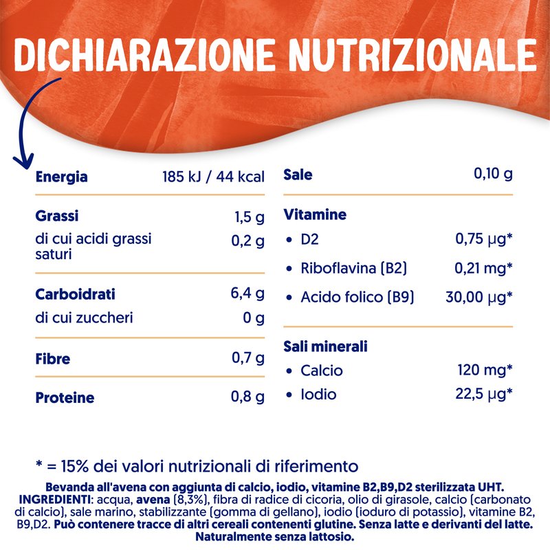 Acqua, avena (11,9%), olio di girasole, calcio (carbonato di calcio), fibra di radice di cicoria, sale marino, stabilizzante (gomma di gellano), iodio (ioduro di potassio), vitamine B2, B9, D2