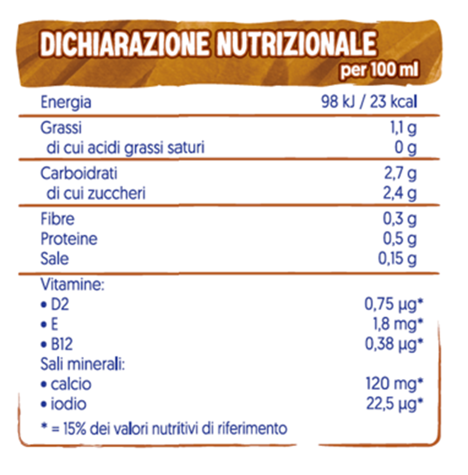 Acqua, mandorla (2,3%), zucchero, calcio (carbonato di calcio), sale marino, stabilizzanti (gomma di guar, gomma di gellano), aroma naturale, emulsionante (lecitine), ioduro di sodio, vitamine B12, D2, E