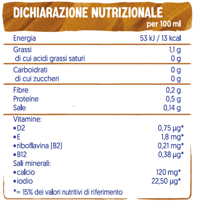Acqua, mandorla (2,3%), calcio (fosfato tricalcico), sale marino, stabilizzanti (farina di semi di carrube, gomma di gellano), emulsionante (lecitine ), aroma naturale (aroma naturale), ioduro di potassio, vitamine B2, B12, D2, E