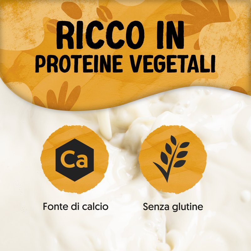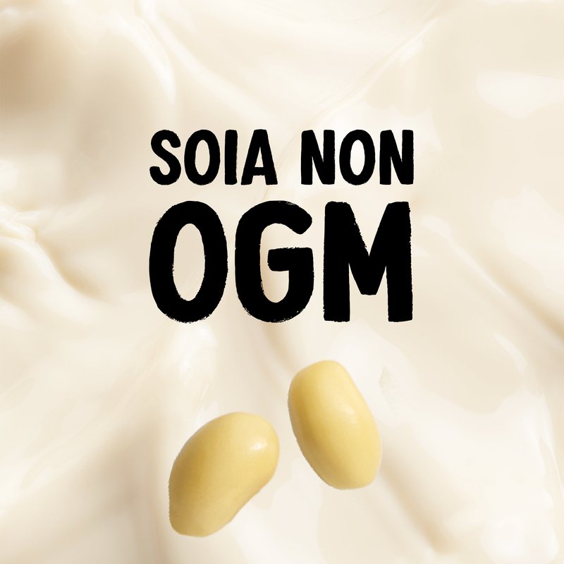 preparazione di soia (acqua, semi di soia decorticati (8%)), fruttosio, correttori di acidità (fosfati di potassio), carbonato di calcio, aromi, stabilizzanti (carragenina, gomma di gellano, gomma di guar, gomma di xanthan), oli vegetali (girasole, karité), sale marino, vitamine (B2, B12, D2).Senza glutine.