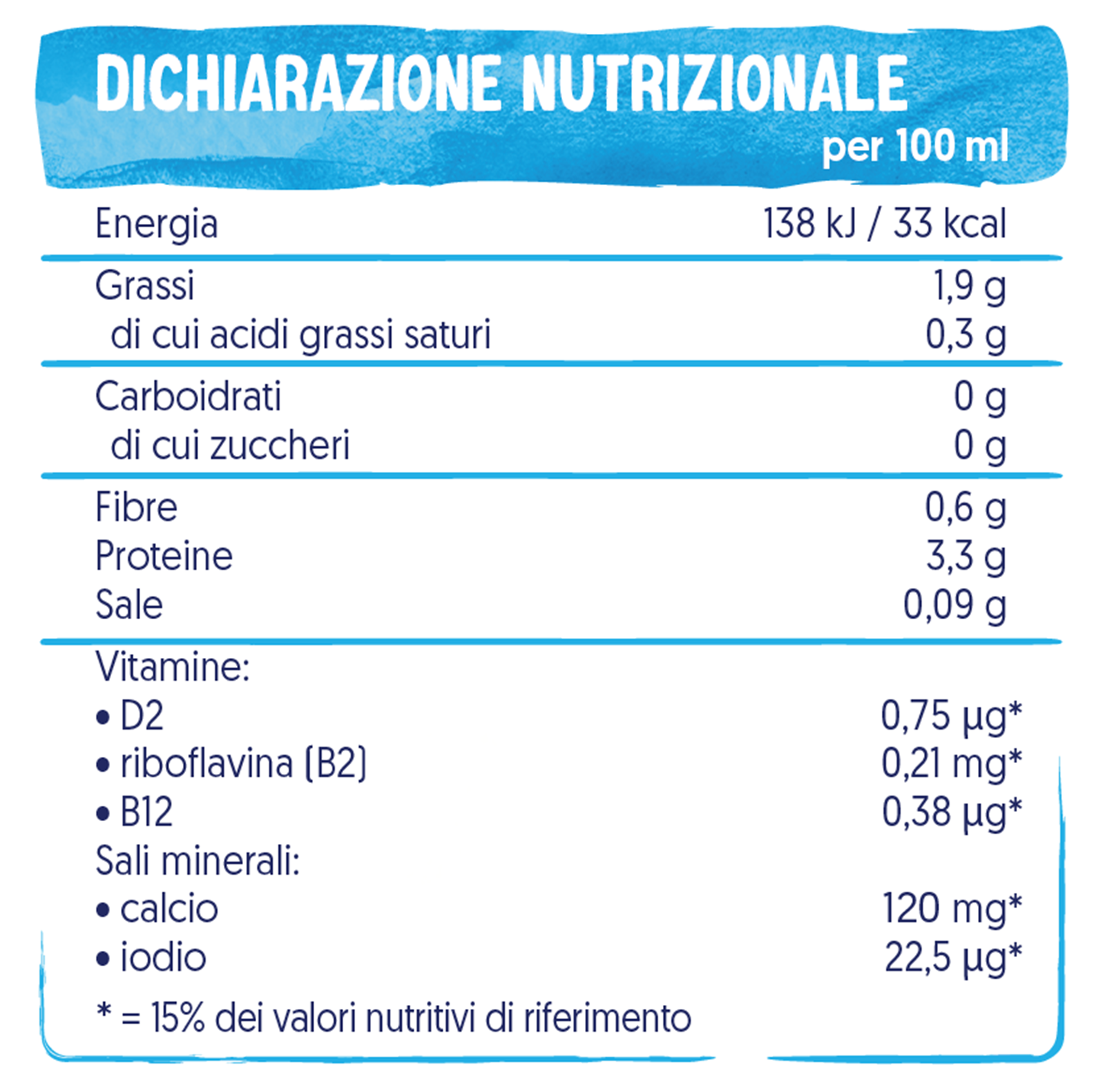 Acqua, semi di soia decorticati (8,7%), correttori di acidità (fosfati di potassio), calcio (carbonato di calcio), aromi, stabilizzante (gomma di gellano), sale marino, ioduro di potassio, vitamine B2, B12, D2