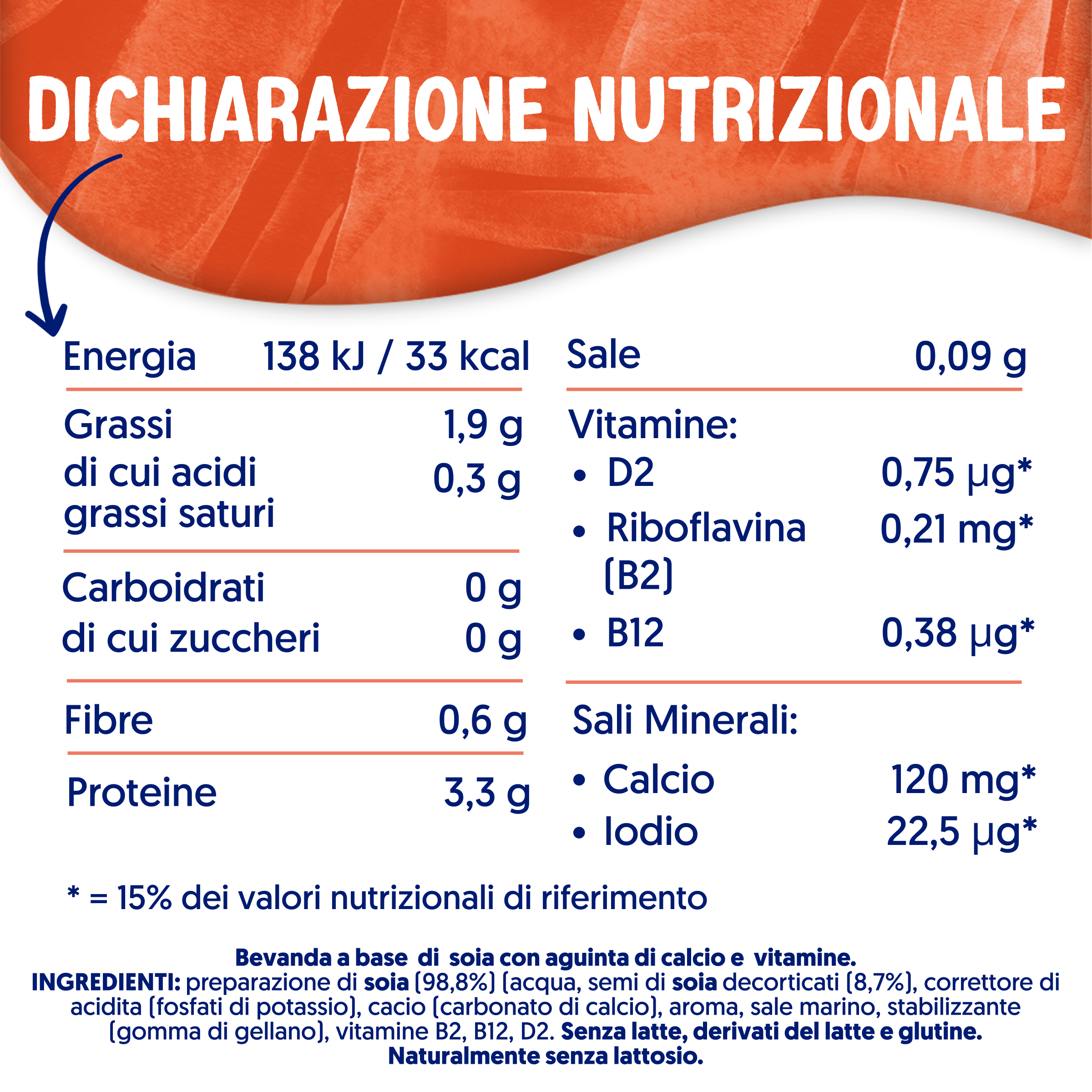 Acqua, semi di soia decorticati (8,7%), correttori di acidità (fosfati di potassio), calcio (carbonato di calcio), aromi, stabilizzante (gomma di gellano), sale marino, ioduro di potassio, vitamine B2, B12, D2