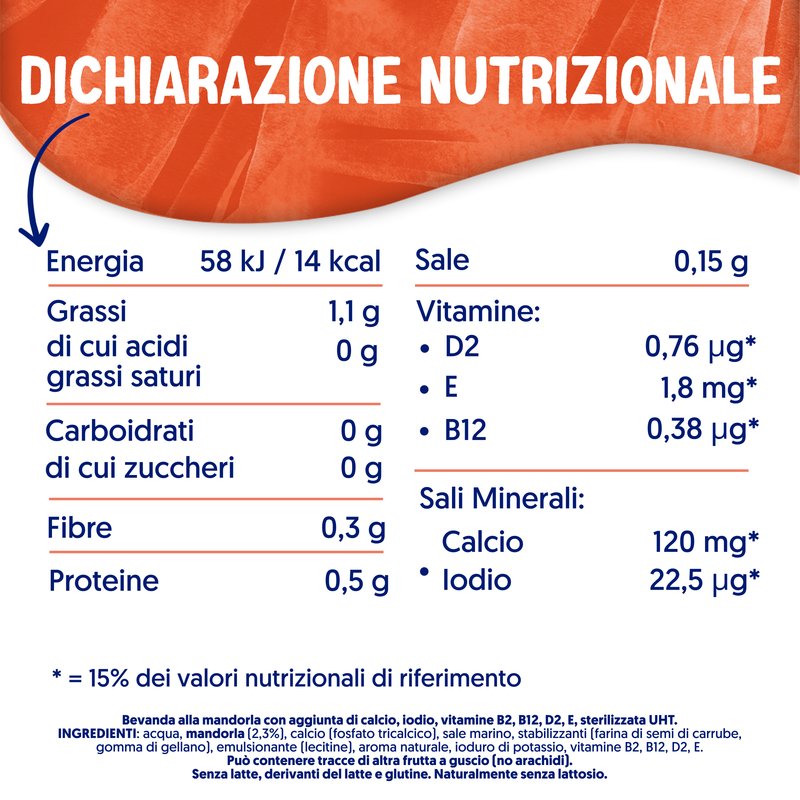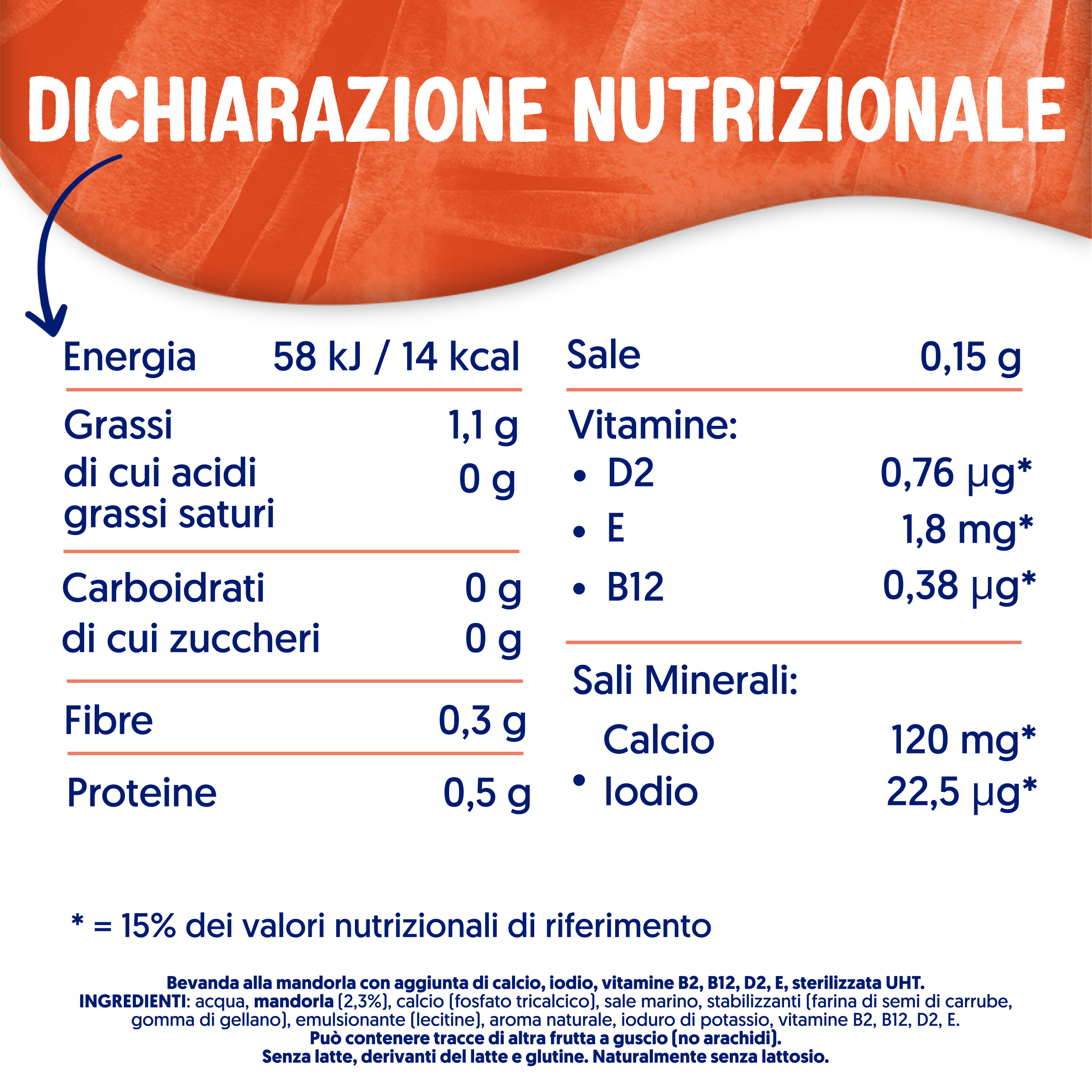 Acqua, mandorla (2,3%), calcio (carbonato di calcio), sale marino, stabilizzanti (gomma di guar, gomma di gellano), aroma naturale, emulsionante (lecitine), ioduro di potassio, vitamine B12, D2, E